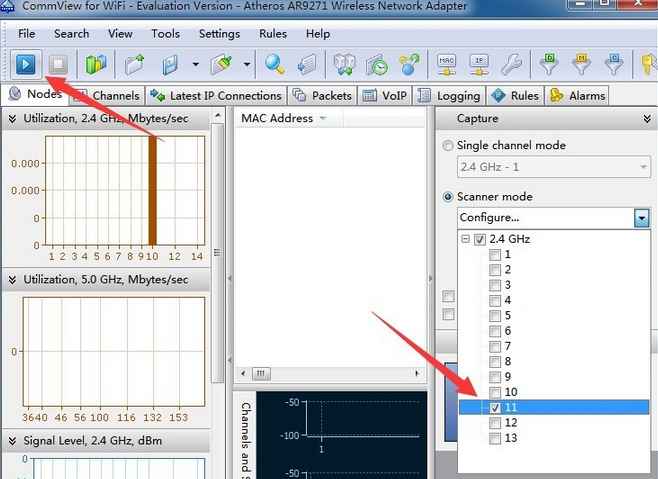 运行“commview for wifi”程序,从“Capture”窗口中,点击“Scanner Mode”(扫描模式)下拉列表,从中选择要扫描的信道,接着在其程序主界面中点击“Scanner”(扫描)“按钮,即可搜索指定俯首下的隐藏WiFi网络。