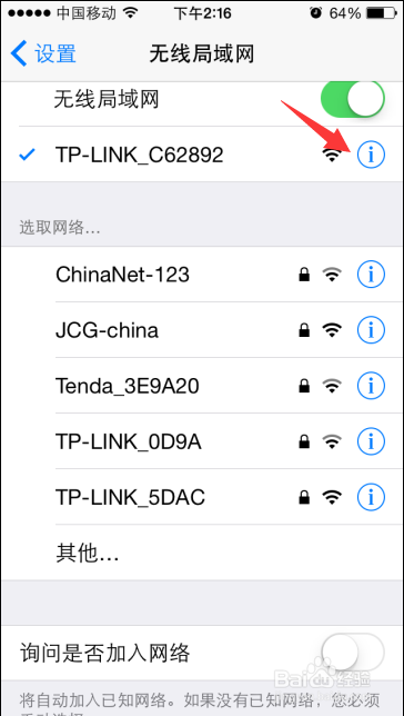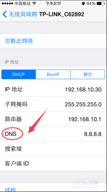 5、服务器出问题了,我们可以通过指定dns服务器ip地址来解决,打开苹果手机无线网络,点击"i"符号进入里面进行修改,把里面的DNS的IP地址修改为8.8.8.8解决。