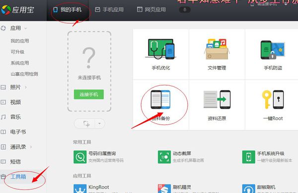 在工 具箱有资料备.份功 能,可以把手机里的东西备一份到电脑里
