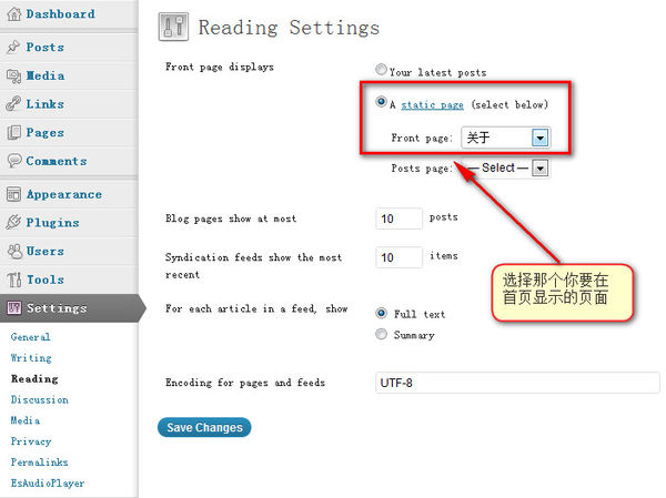 去你后台找到设置(Settings)-->阅读(Reading),然后将首页显示(Frontpagedisplays)设置为一个静态页面(Astaticpage),也就是你新建的那个要显示的页面了,我的后台是英文界面,你将就一下吧