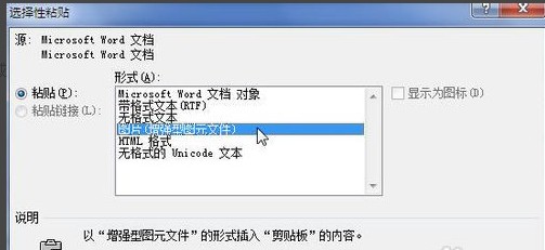 3、在打开的“选择性粘贴”对话框中选中“粘贴”单选框,然后在“形式”列表中选中一种粘贴格式,例如选中“图片(Windows图元文件)”选项,并单击“确定”按钮;