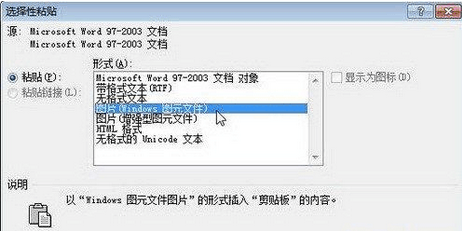 某种特殊情况下,可能需要将WORD中文字或表格转变成图片格式,一般做法是用屏幕截图软件来完成这一转变,还有没有更简单的方法呢?当然有,在WORD中将需要转成图形的文字选中并复制或剪切,单击菜单“编辑/选择性粘贴”命令,在“选择性粘贴”对话框中选取一种图片类型(有“图片、增强型图元文件”两种格式可供选择),单击“确定”,即可将文字转为图片格式。