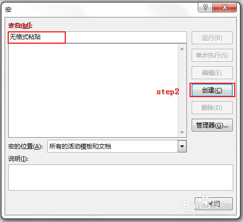3、出现”宏“窗口,在宏名下输入”无格式粘贴“,点击创建按钮或者回车