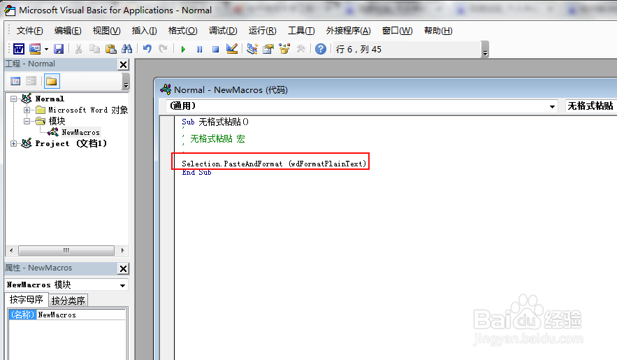 4、出现”宏“命令编辑窗口(即VB代码编写窗口),在如图位置输入”Selection.PasteAndFormat (wdFormatPlainText)“