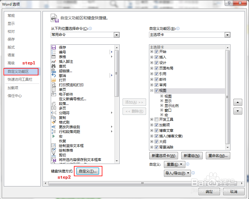 6、出现”Word选项“界面,单击界面左边“自定义功能区”,然后单击“自定义(T)...”按钮。