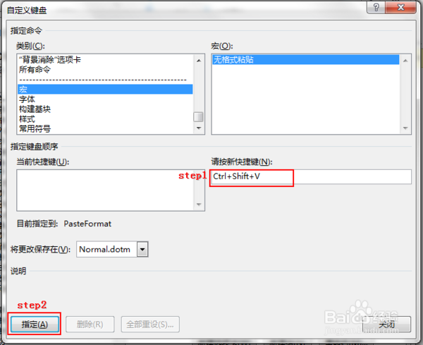 8、在“请按快捷键”下面文本框中单击,直接使用键盘输入你想设置的快捷键,例如按下Ctrl+Shift+V,然后单击“指定”按钮
