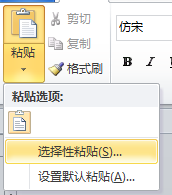方法一:用鼠标单击“开始”功能区中“粘贴”按钮下方的三角按钮,选择“选择性粘贴”命令。