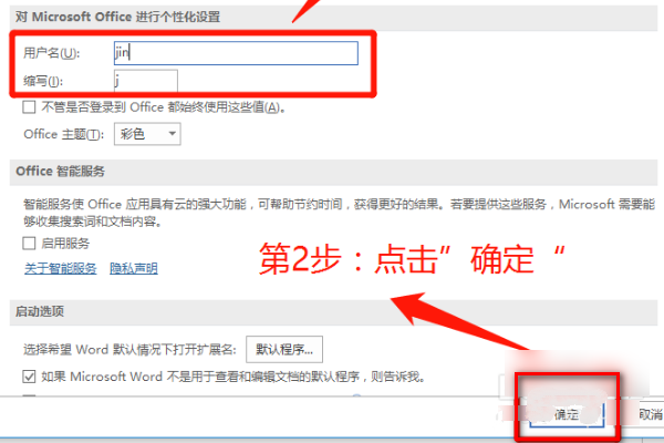 3、在“对 Office 副本进行个性化设置”下,更改您要在自己的批注中使用的姓名或缩写。