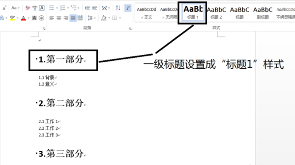 2、选中一级标题,点击样式里的“标题1”,依次将所有的一级标题进行设置,如下图所示。