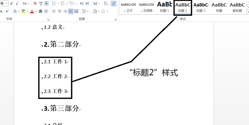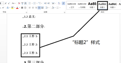 2、选中二级标题,点击样式里的“标题2”,依次完成二级标题设置。