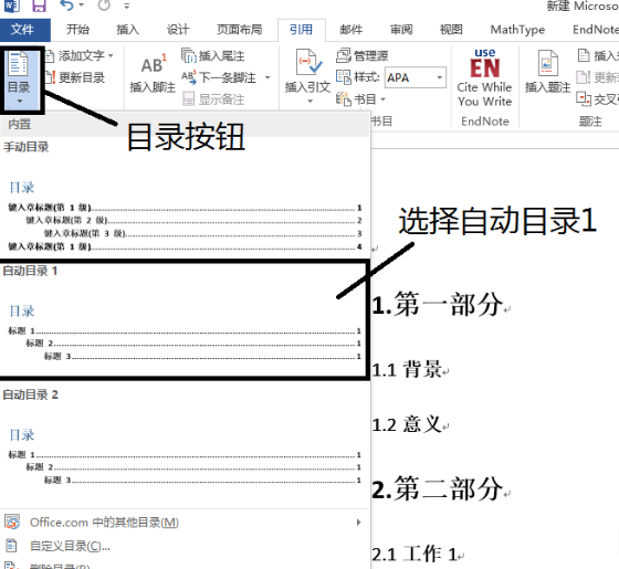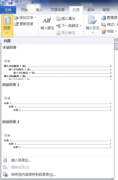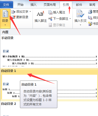 第二步:点击【引用】---【目录】,然后选择【自动目录1】或者【自动目录2】