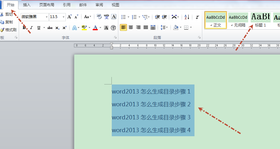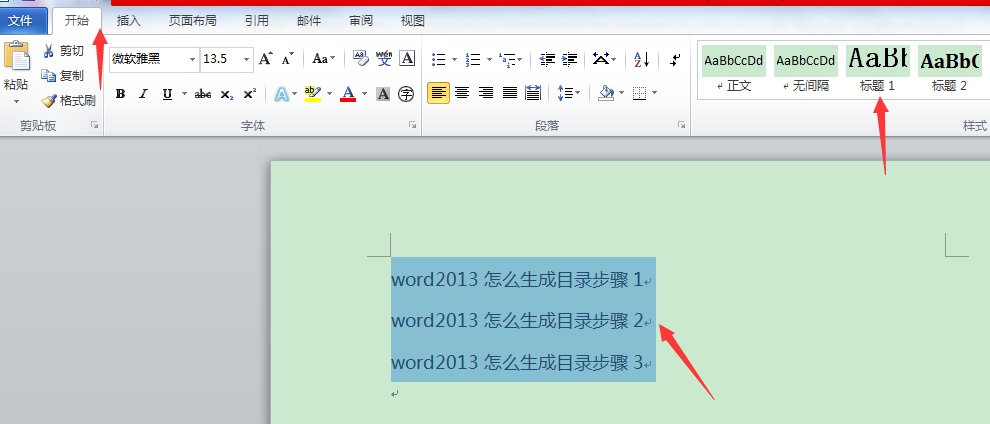 第一步:选中标题内容,点击开始菜单,设置标题内容的格式,如标题1