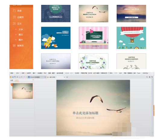 6.准备工作结束之后,接下来就是开始设计正文内容了,为了保证PPT课件的漂亮美观,只有单调的文字是远远不够的,还应图文并茂,点击【正文】选项,选择合适的文字架构及图片,如下图所示。