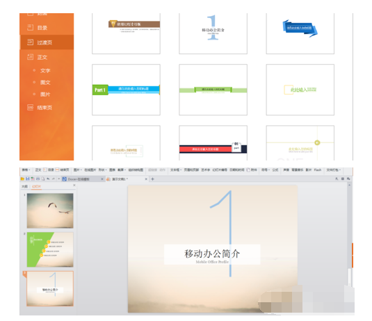 5.目录选择完毕之后,接下来再点击【过渡页】选项,为每一个标题设置一个漂亮的过渡页,如下图所示。