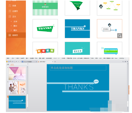 2.然后点击上方菜单栏里的【插入】功能键,在插入功能键里有正文、封面、目录、过渡页、结束语等选项,通过这些功能即便从来没用过WPS演示的朋友也能快速的做出一个漂亮的PPT演示课件了。