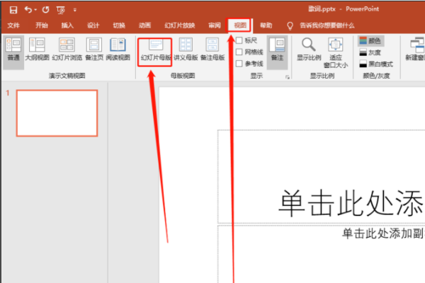 2、然后点击【视图】菜单,点击“母版视图”栏的“幻灯片母版”。