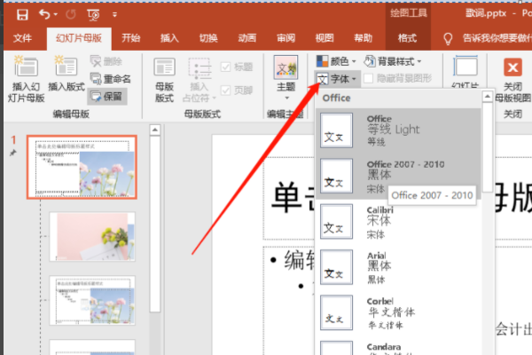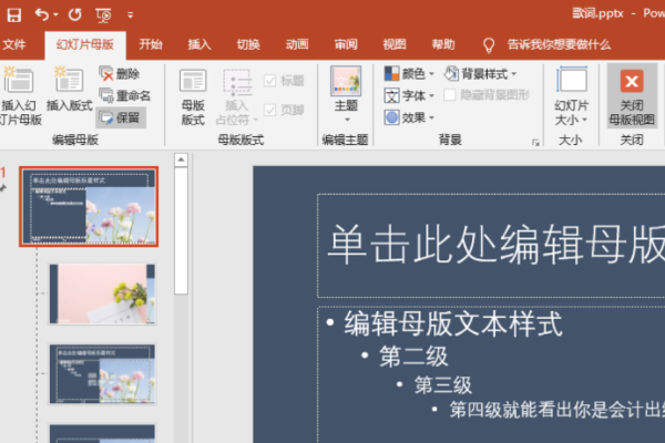 6、点击【幻灯片母版】,可以进行字体,主题,背景效果等设置,设置为自己需要的背景,样式。