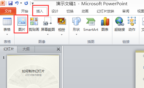 3、然后我们选择第一张PPT,点击【插入】菜单,点击“图像”栏中“图片”。
