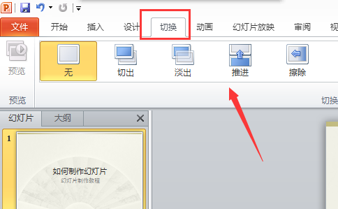 8.文字书写完毕后,点击上方的“切换”,点击一页幻灯片,然后选择这一页幻灯片的切换动画,其他页以此类推;