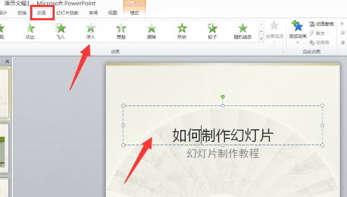 9.点击“动画”,选择幻灯片正文里的内容,然后选择合适的动画,就能为每一段文字或者图片添加动画效果了;