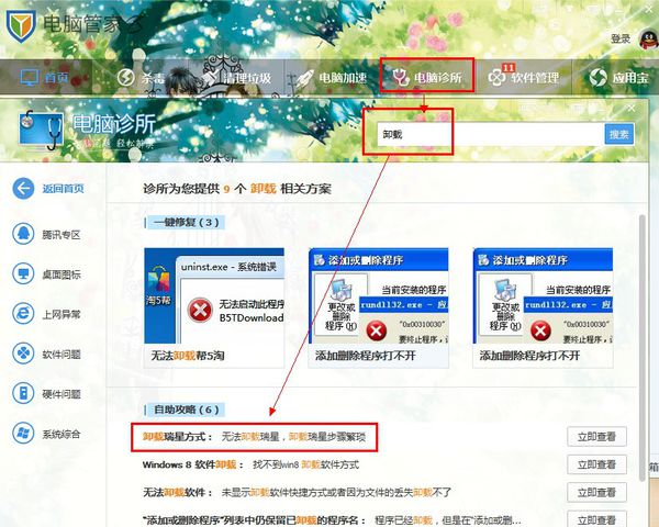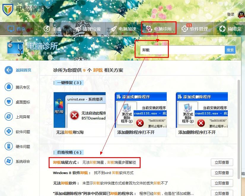 打开腾讯电脑管家——电脑诊所——搜索【卸载瑞星】