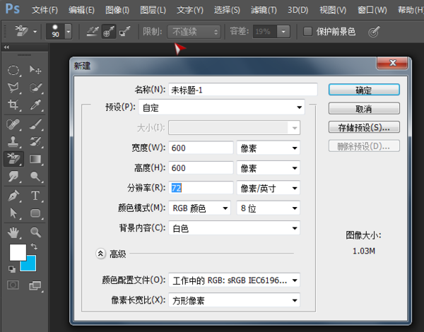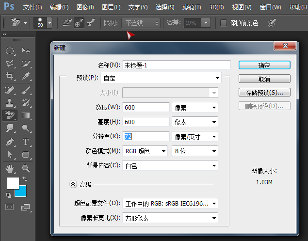 1、打开PS软件,新建一个600x600 72 px 白色背景的画布。