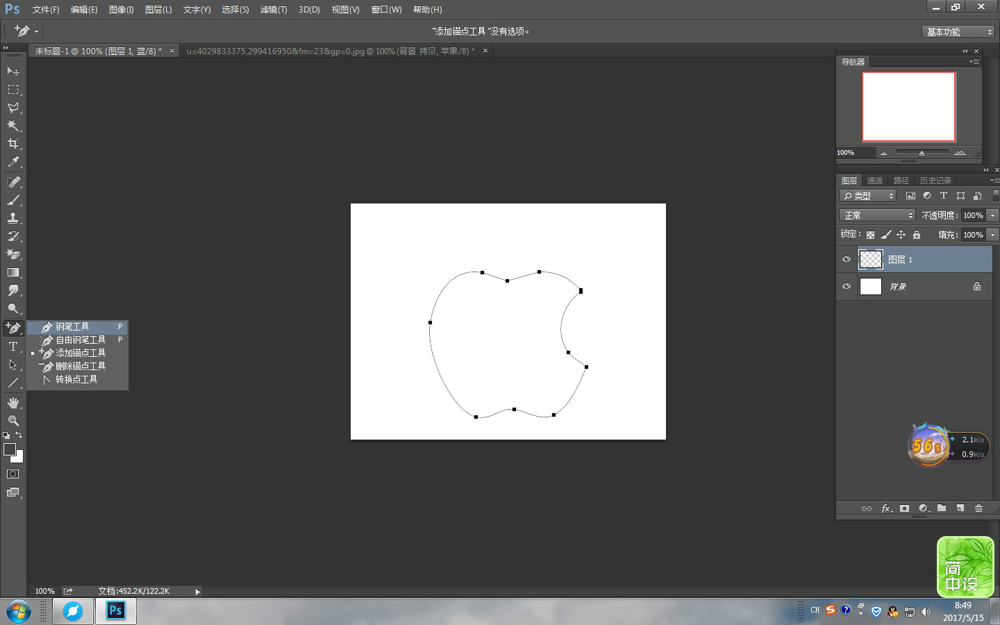 2、打开“钢笔工具”,绘制一个苹果标志路径;