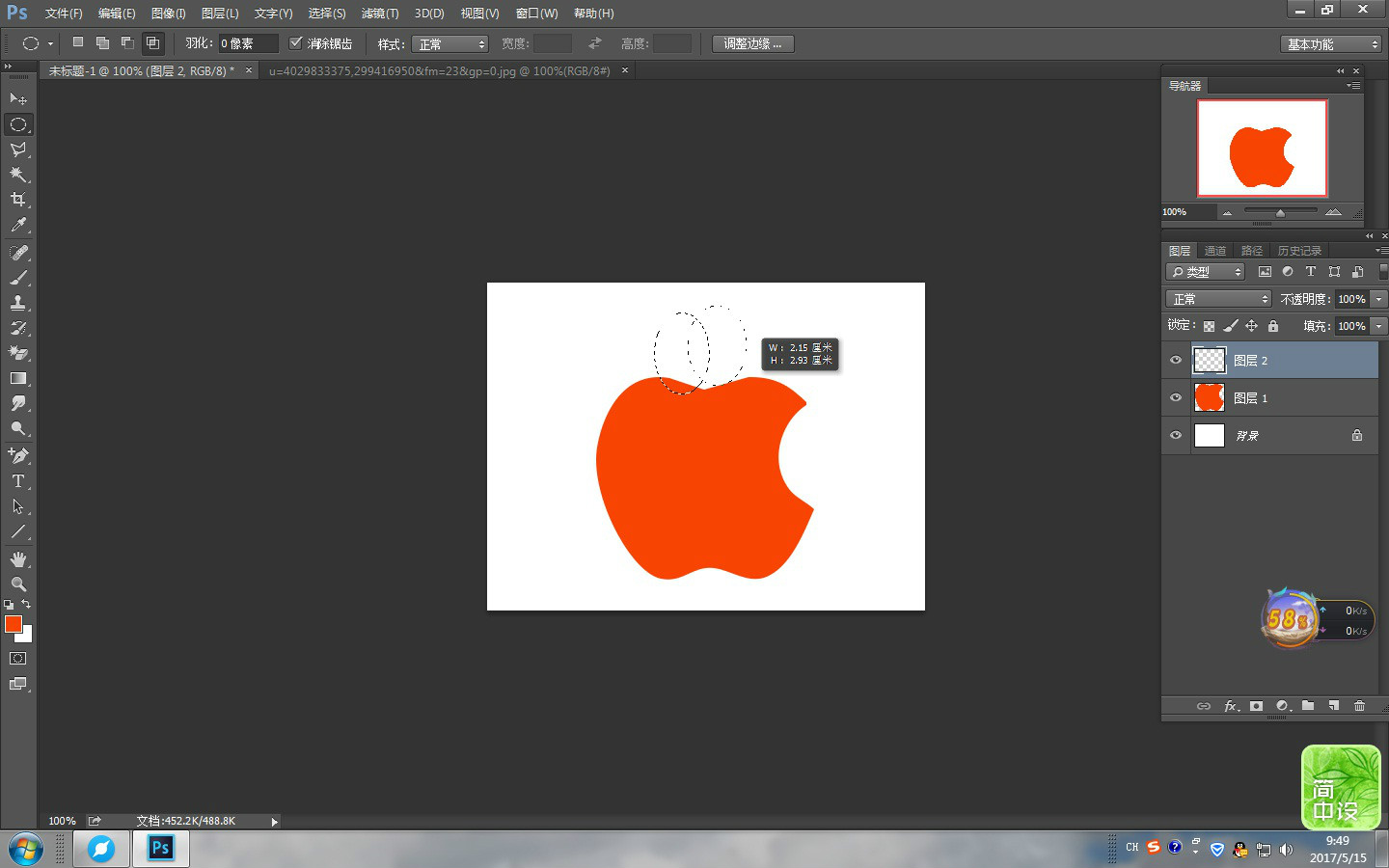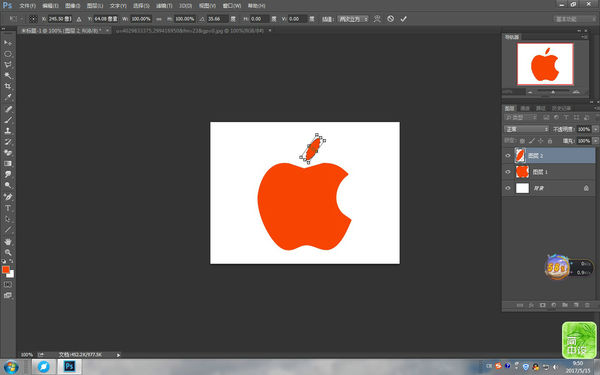 4、打开“椭圆形选框工具”,绘制一个椭圆选区,点击“与选区交叉”,再绘制一个同样大小的椭圆选区,绘制苹果叶子,用喜欢的颜色填充,ctrl+t调整大小位置;