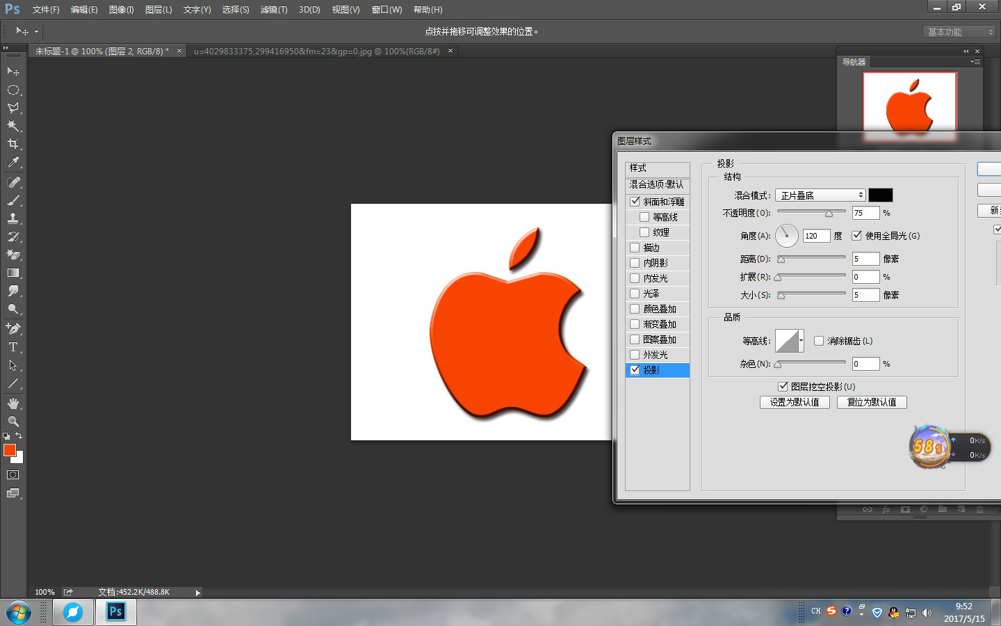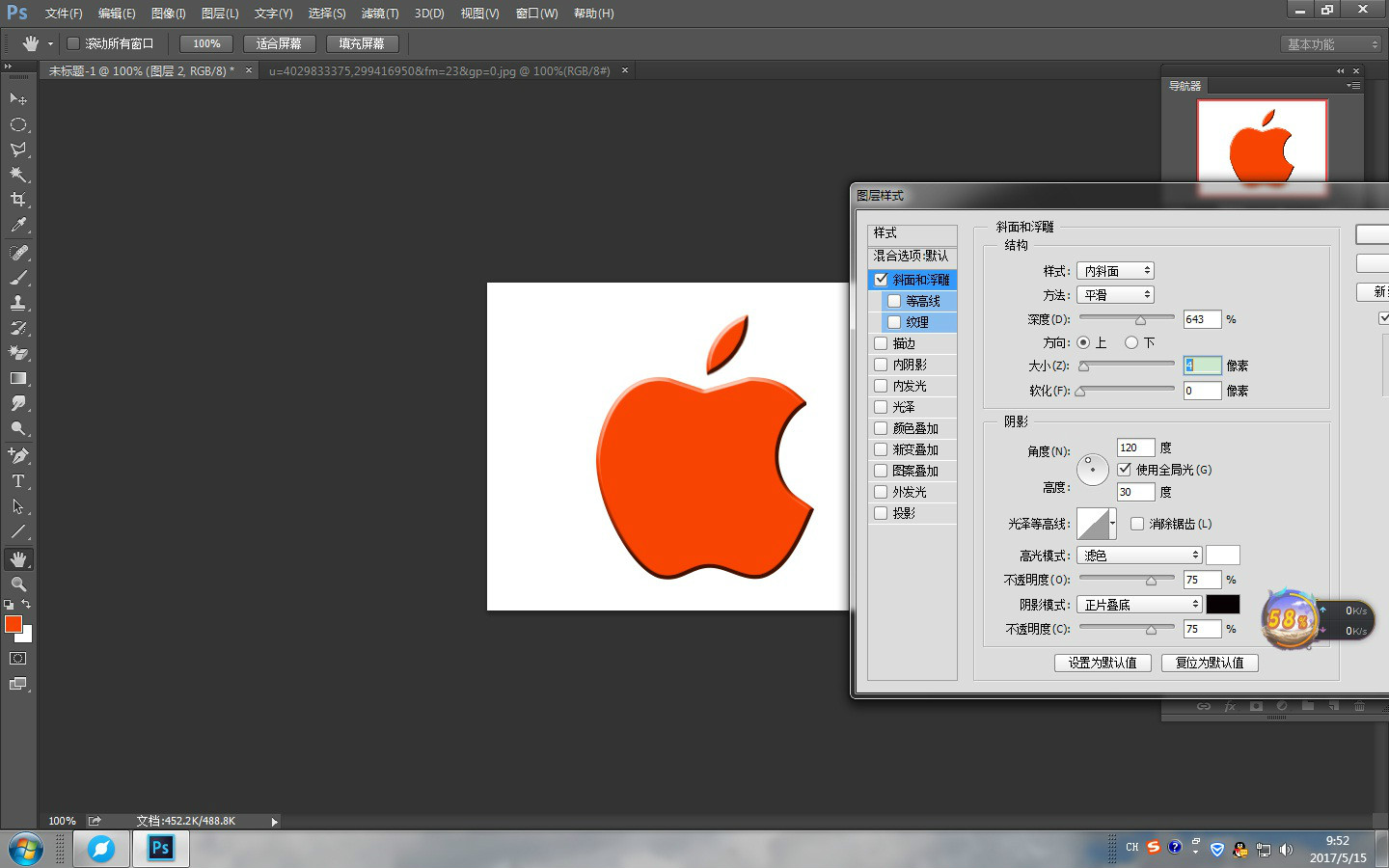 5、合并图层,双击调出“图层样式”,设置“斜面和浮雕”、“投影”等;