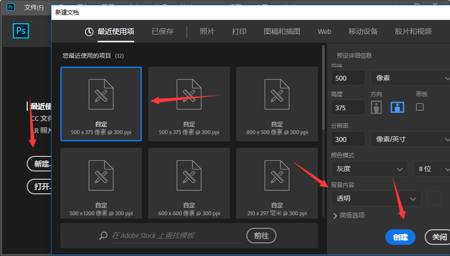 1、首先打开PS软件,然后选择“新建”,选择自己需要的画布大小,将“背景内容”修改为“透明”,点击“创建”。