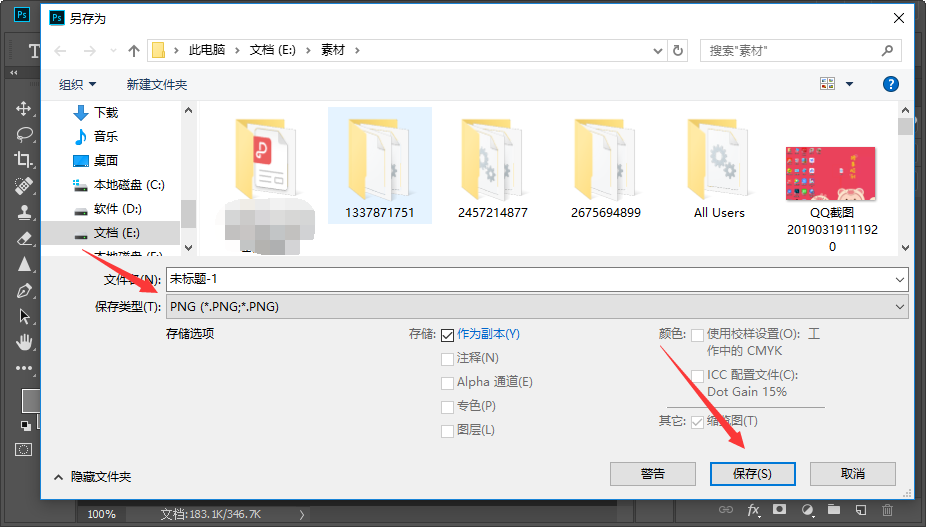 4、最后在上方工具栏中选择“文件”-“存储为”,在对话框中将“保存类型”修改为PNG格式,点击“保存”即可制作透明的文字或LOGO。