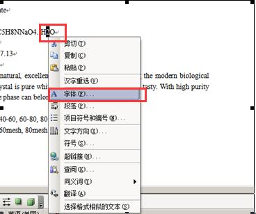 1. 输入文字,将需要设置成下标的文字选中,右击选择“字体”。