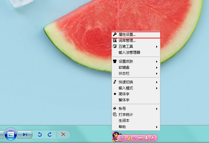 二、接着在QQ五笔输入状态栏点击右键,弹出的菜单中点击“属性设置”。