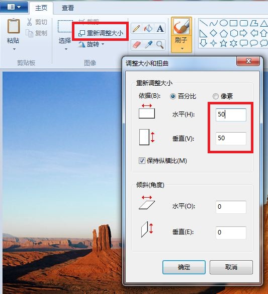 3.打开画图软件,选择重新调整大小,在保持纵横比的条件下,输入水平比例,如50,即缩小50%,然后确定