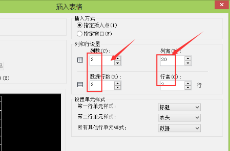 4、点击表格选项,在弹出的对话框内设置表格的行数和列数,并设置行高和列宽,如图所示: