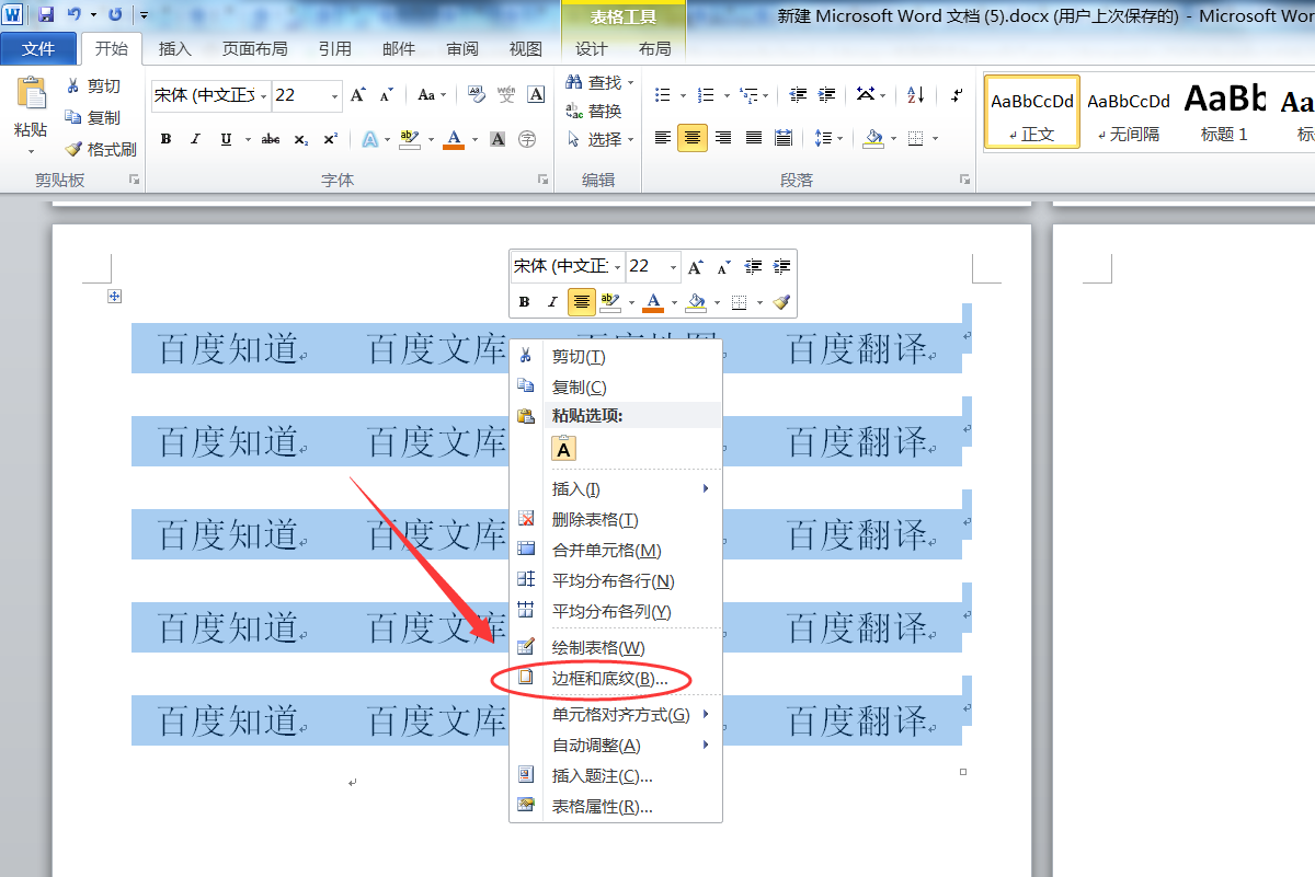 2、第二步全选表格,鼠标右键表格线,选择边框和底纹。
