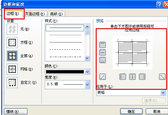 2、在边框标签页,颜色选择黑色,在线宽选项中选择一个较粗的线宽,点击左侧的“全部”绘制表格所有边框,然后点击右下角的确定按钮即可。