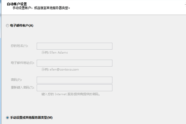 1、在outlook2013中添加账户。具体操作为:文件-->信息-->添加账户,选择“手动设置或其它服务器类型”然后点击“下一步”