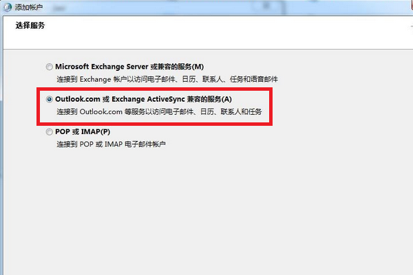 2、选择第二个选项“outlook.com或exchange Activitysync兼容的服务”然后点击“下一步”