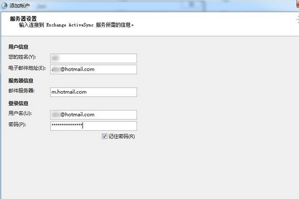 3、按图填写各项信息,尤其注意服务器的地址是m.hotmail.com。然后点击“下一步”