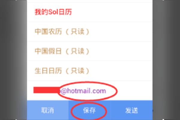 5、在sol日历设置里选择保存日历的位置为Hotmail邮箱,点击“保存”,即可将outlook日历与安卓手机日历同步