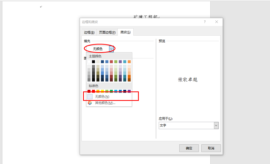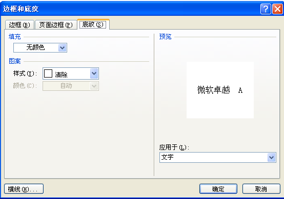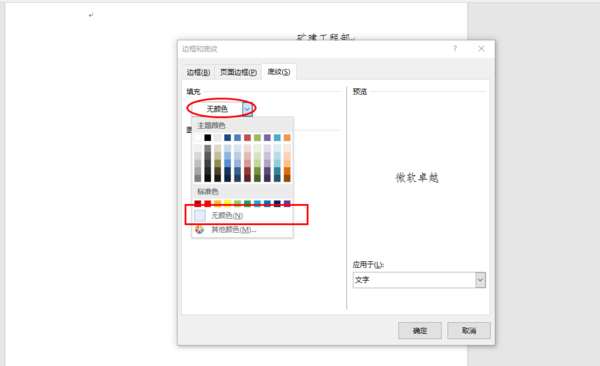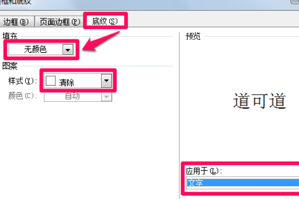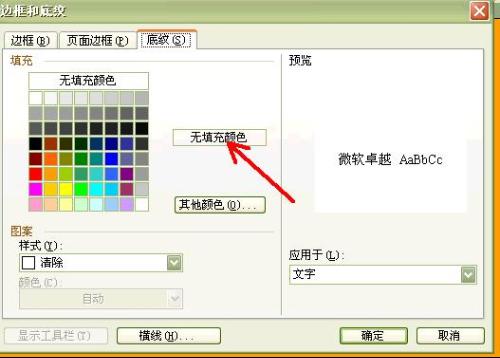 2、在边框和底纹中点击“底纹”,填充中点击“无颜色”,图案样式中点击“清除”,右侧“应用于”中下拉点击“文字”,点击“确定”即可。