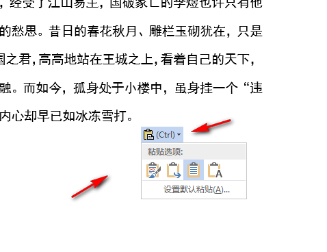 复制文件后,点粘贴时,在文档右下角会显示一个图标,点下图标下拉三角,弹出的菜单中选择自己想要的粘贴方式。