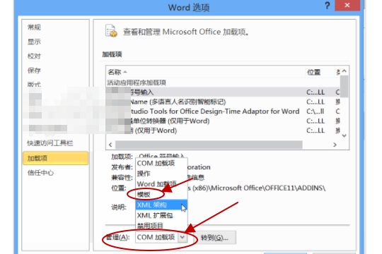 3、点击加载项选项,我们在其界面内找到管理选项,在管理的选择内选择模板选项,然后点击转到选项在弹出的对话框内找到模板和加载项对话框;