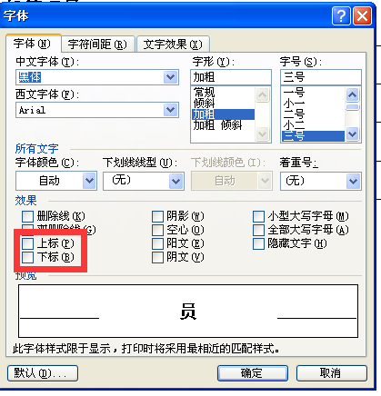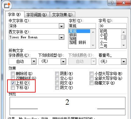 ②在弹出的字体对话框中的“效果”下面我们可以看到上标、下标的选项,勾选确定即可。