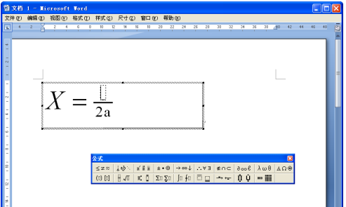 3、在公式编辑文本框中直接输入“X=”,单击“公式”工具栏中的“分式和根式模版”按钮,在弹出的菜单中单击“标准尺寸的竖分式”按钮,即可输入一个分数线,如图所示。