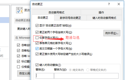 5、将句首字母大写 勾选框取消勾选选项,鼠标左键单击: