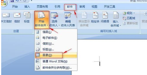 1、新建一个Word文档,选择“邮件”-“开始邮件合并”-“目录”命令。