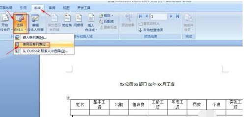 3、选择“邮件”-“开始邮件合并”-“选择收件人”-“使用现有列表”命令。