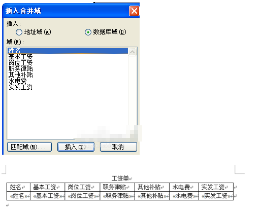 第八,调出邮件合并工具栏,点击工具——信函与邮件——显示邮件合并工具栏。光标定位在姓名下方的格子,点击工具栏上第六个按钮“插入域”,选姓名,点“插入”按钮